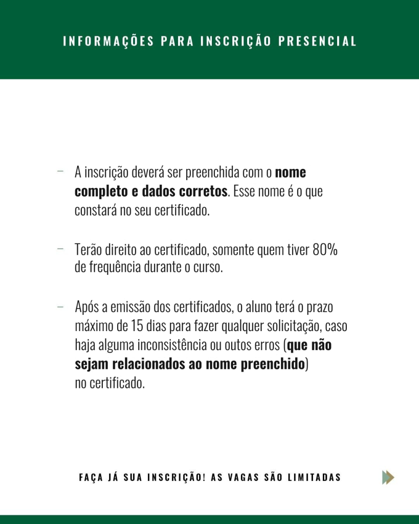 – Quem participar do curso e obter frequência mínima de 80% terá direito ao certificado