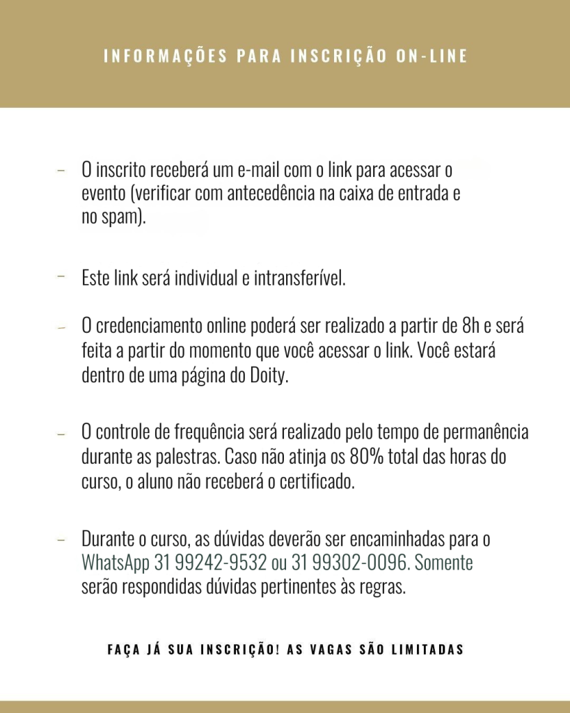 – Durante o curso, as dúvidas deverão ser encaminhadas para o WhatsApp (31) 99242-9532. Somente serão respondidas dúvidas pertinentes às regras.