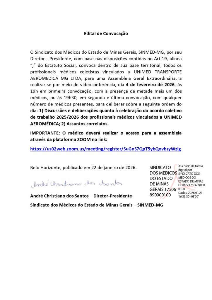 Assembleia Geral dos médicos celetistas vinculados à Unimed Aeromédica MG
