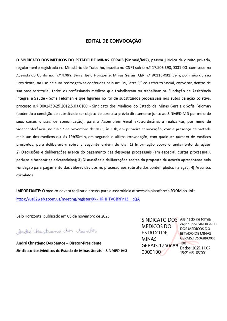 Assembleia geral dos médicos que trabalharam ou trabalham na Fundação de Assistência Integral a Saúde – Sofia Feldman e que figurem no rol de substituídos processuais nos autos da ação coletiva, processo n.º 0001430-25.2012.5.03.0109