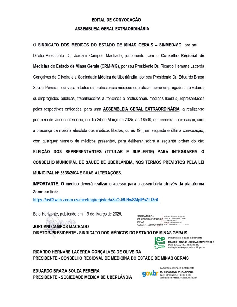 Assembleia geral dos profissionais médicos que atuam como empregados, servidores ou empregados públicos, trabalhadores autônomos e profissionais médicos liberais, representados pelas entidades CRMMG, Sinmed-MG e Sociedade Médica de Uberlândia