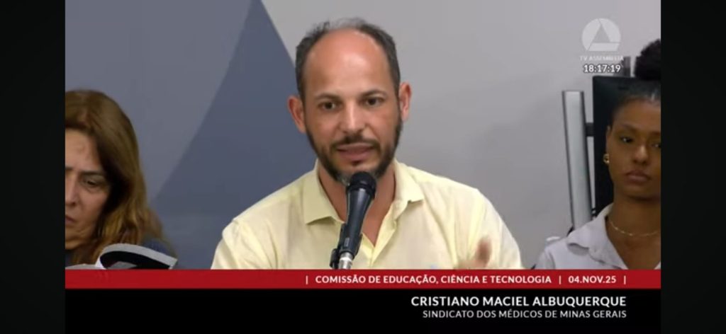 Diretor de Mobilização do Sinmed-MG, Cristiano Maciel, durante a audiência – Fonte: TV Assembleia