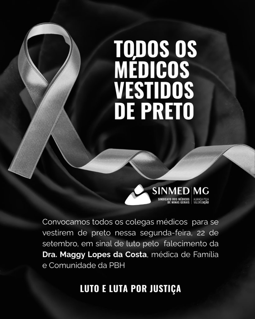 Convocamos todos os médicos a vestirem-se de preto nesta segunda-feira, dia 22 de setembro, em sinal de luto e respeito pela Dra. Maggy Lopes da Costa. Dra. Maggy foi uma dedicada médica de Família e Comunidade da PBH, que tocou a vida de muitos com sua paixão e cuidado. Esta é a nossa forma de honrar sua memória e seu legado.